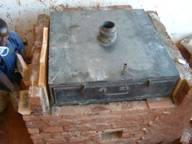 One 100 L fixed institutional stove made with insulated ceramic (VIC) and Kajansi firebrick was constructed at UIRI. This stove can be built with or with out chimney. Chimneyless model is shown here. Note the absence of smoke above the pot or large amounts of wood in the combustion chamber