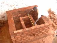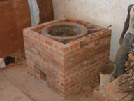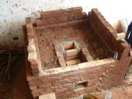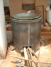 One 100 L fixed institutional stove made with insulated ceramic (VIC) and Kajansi firebrick was constructed at UIRI. This stove can be built with or with out chimney. Chimneyless model is shown here. Note the absence of smoke above the pot or large amounts of wood in the combustion chamber
